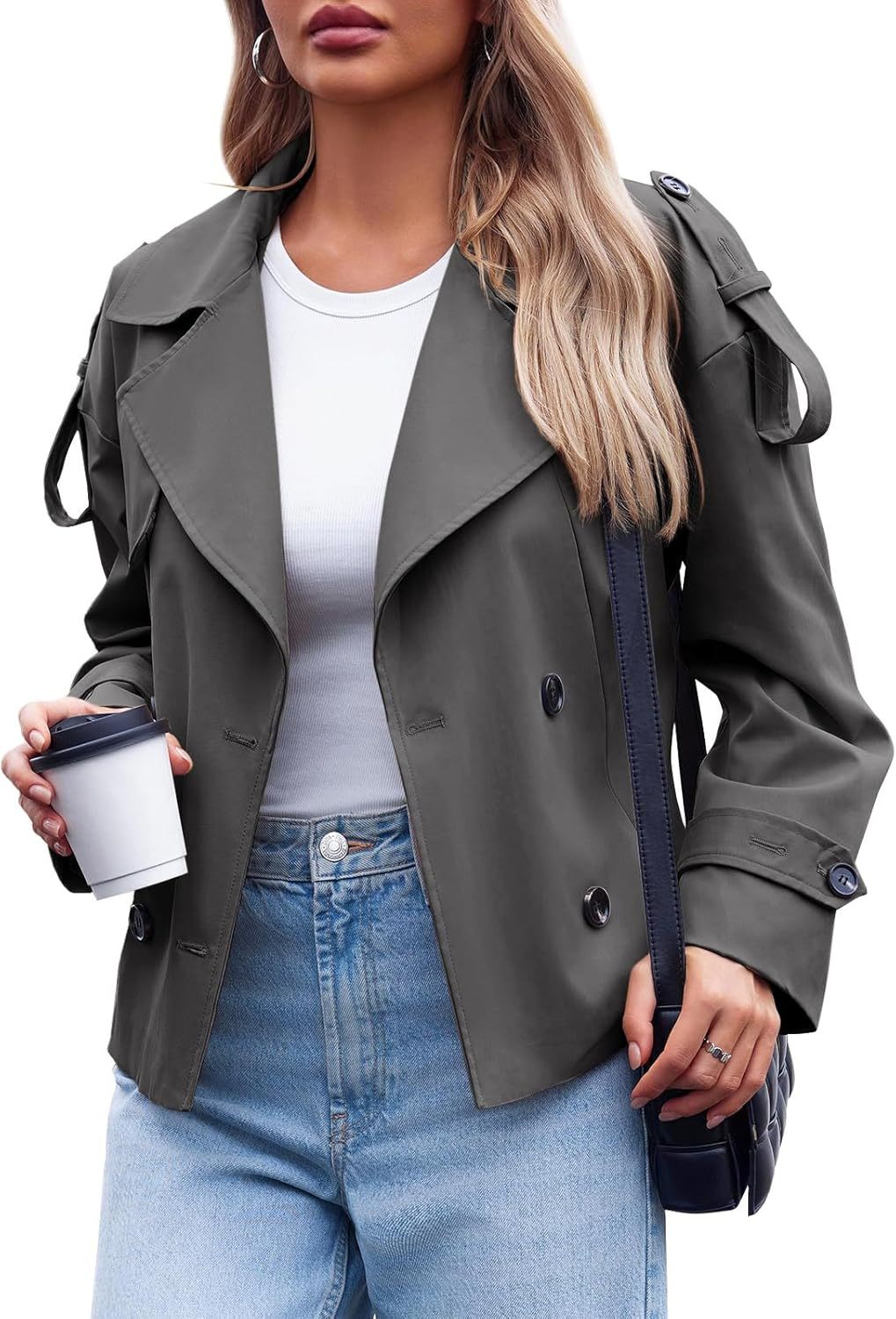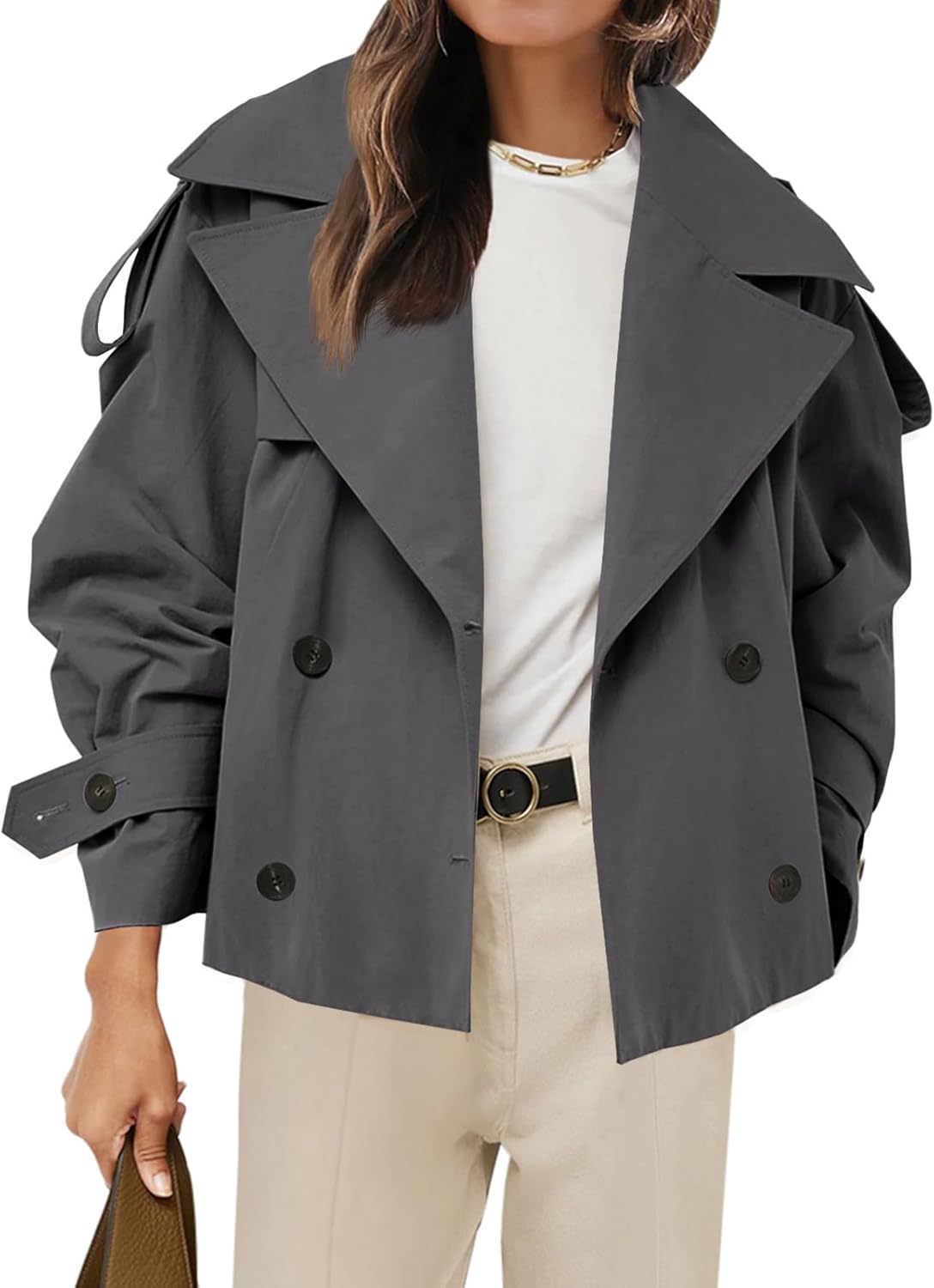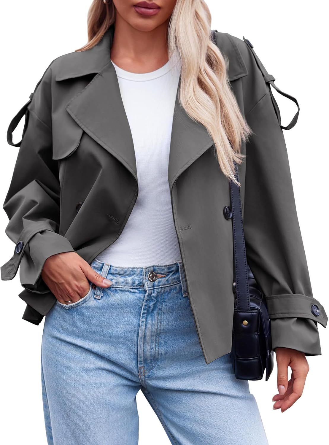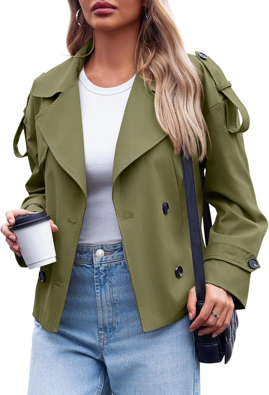 Tankaneo Womens Cropped Trench Coat Casual Double Breasted Short Jacket Fall Fashion Outerwear with Belt