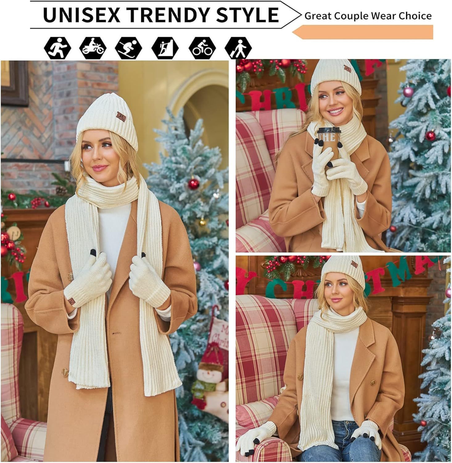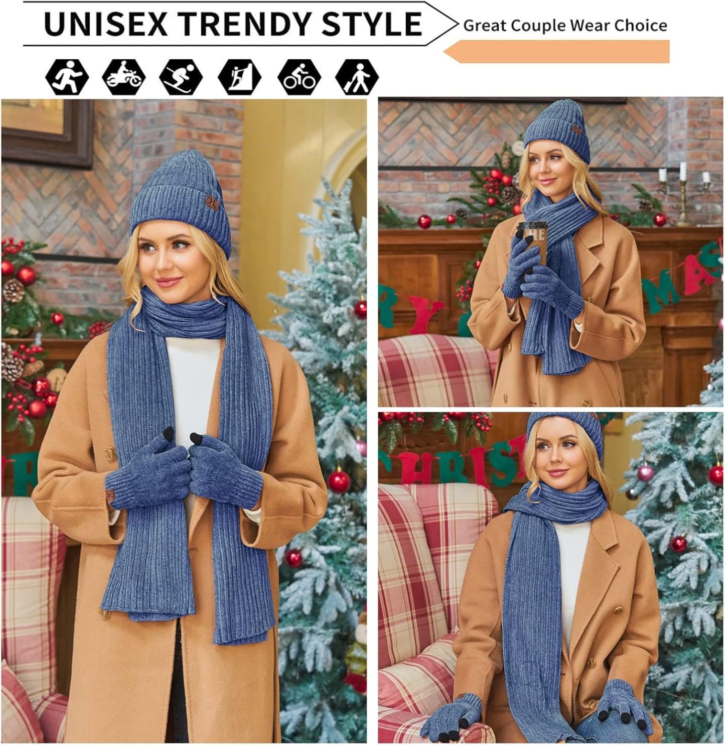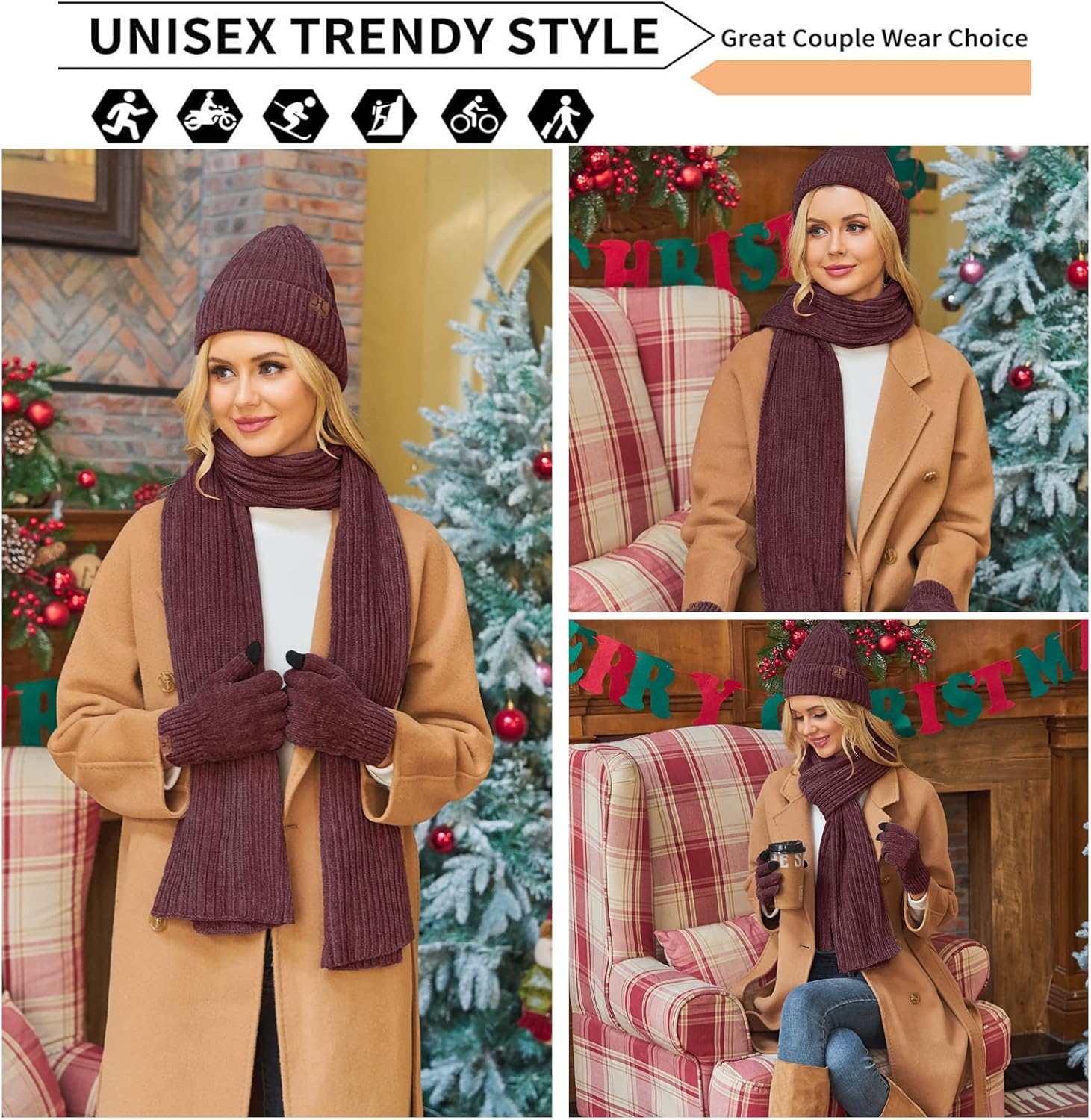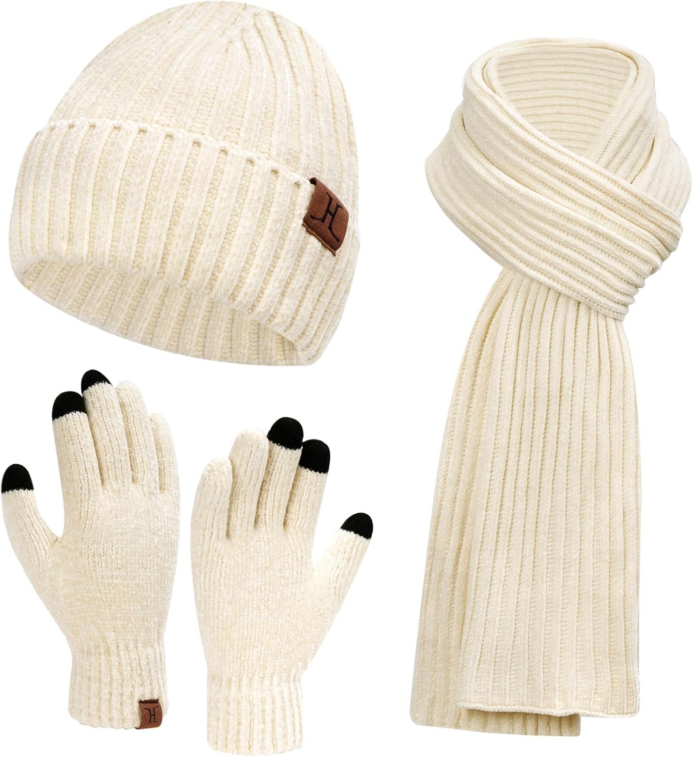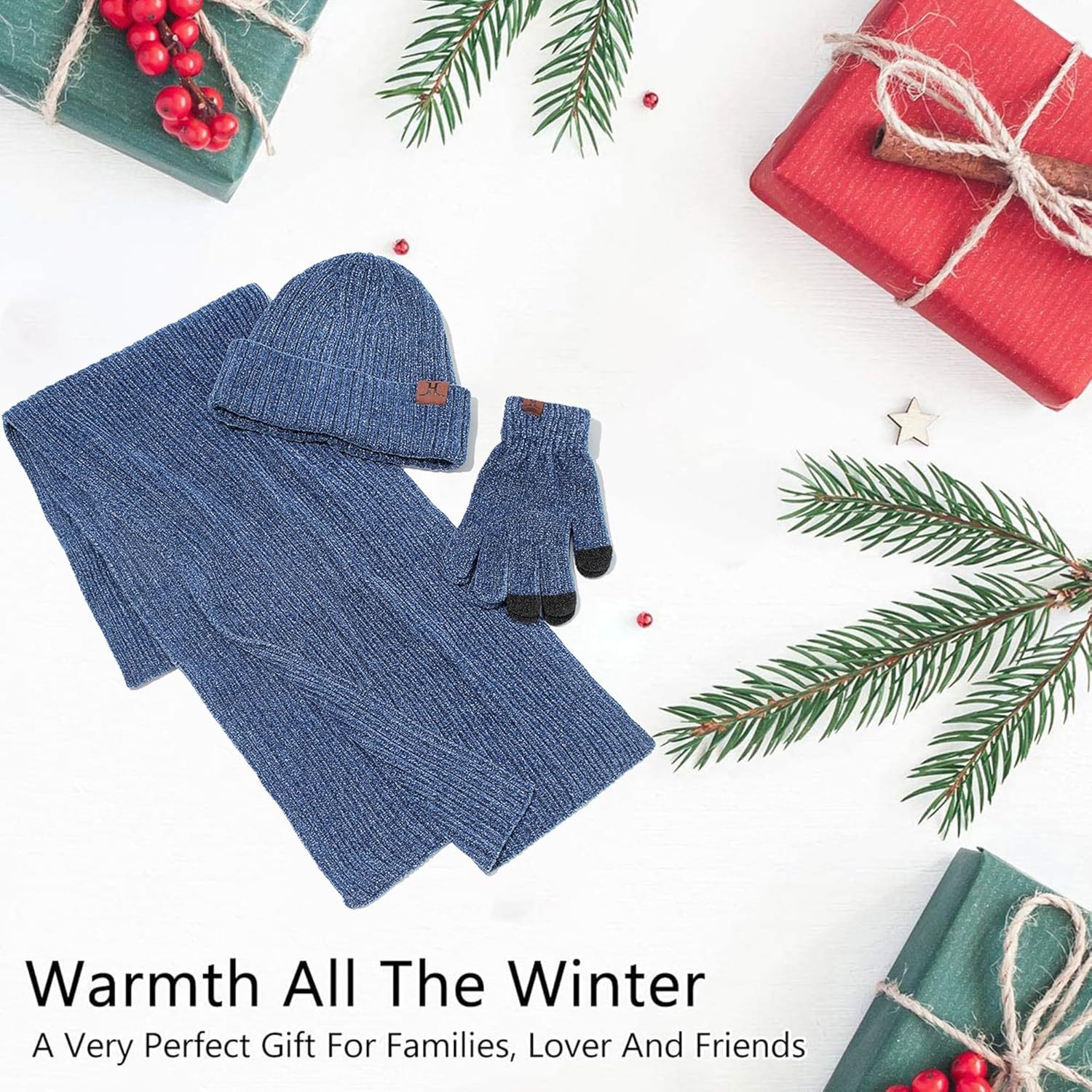 Womens Winter Knit Warm Hat Beanie Long Scarf Touch Screen Gloves Set Skull Caps Neck Scarves for Women