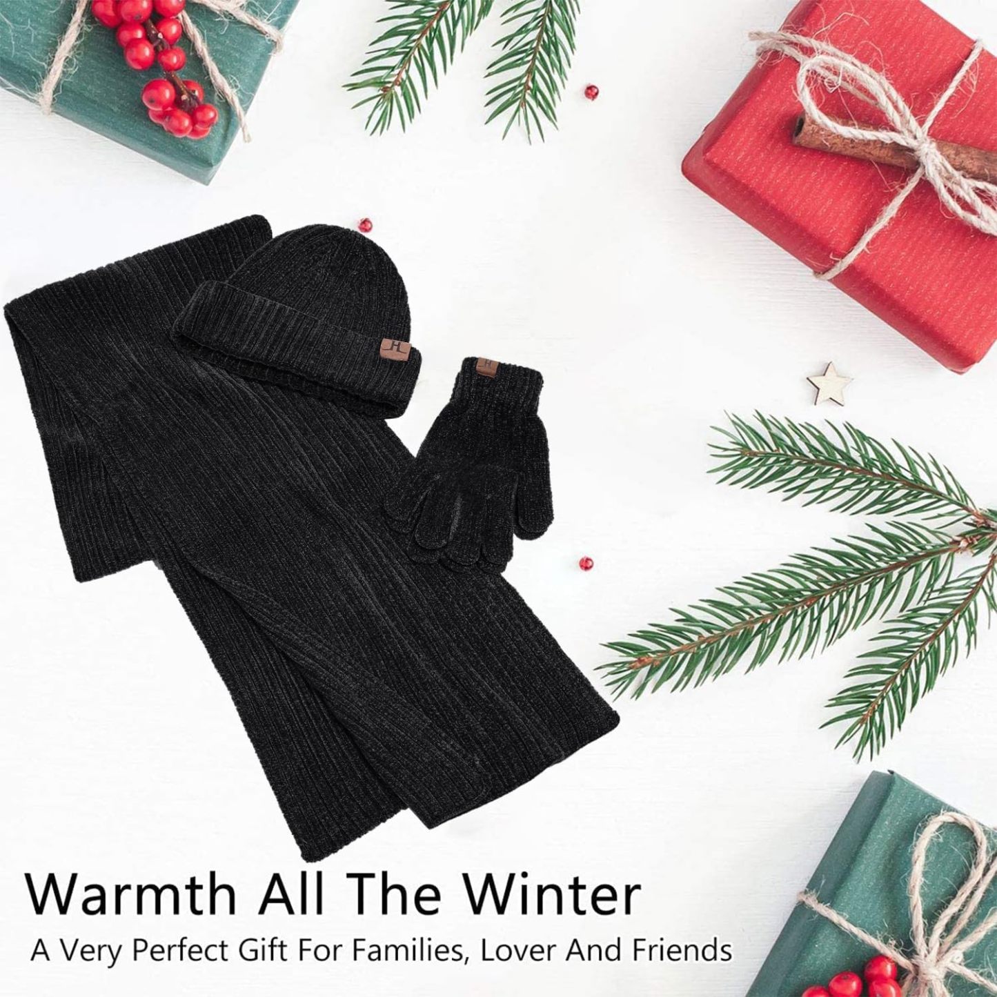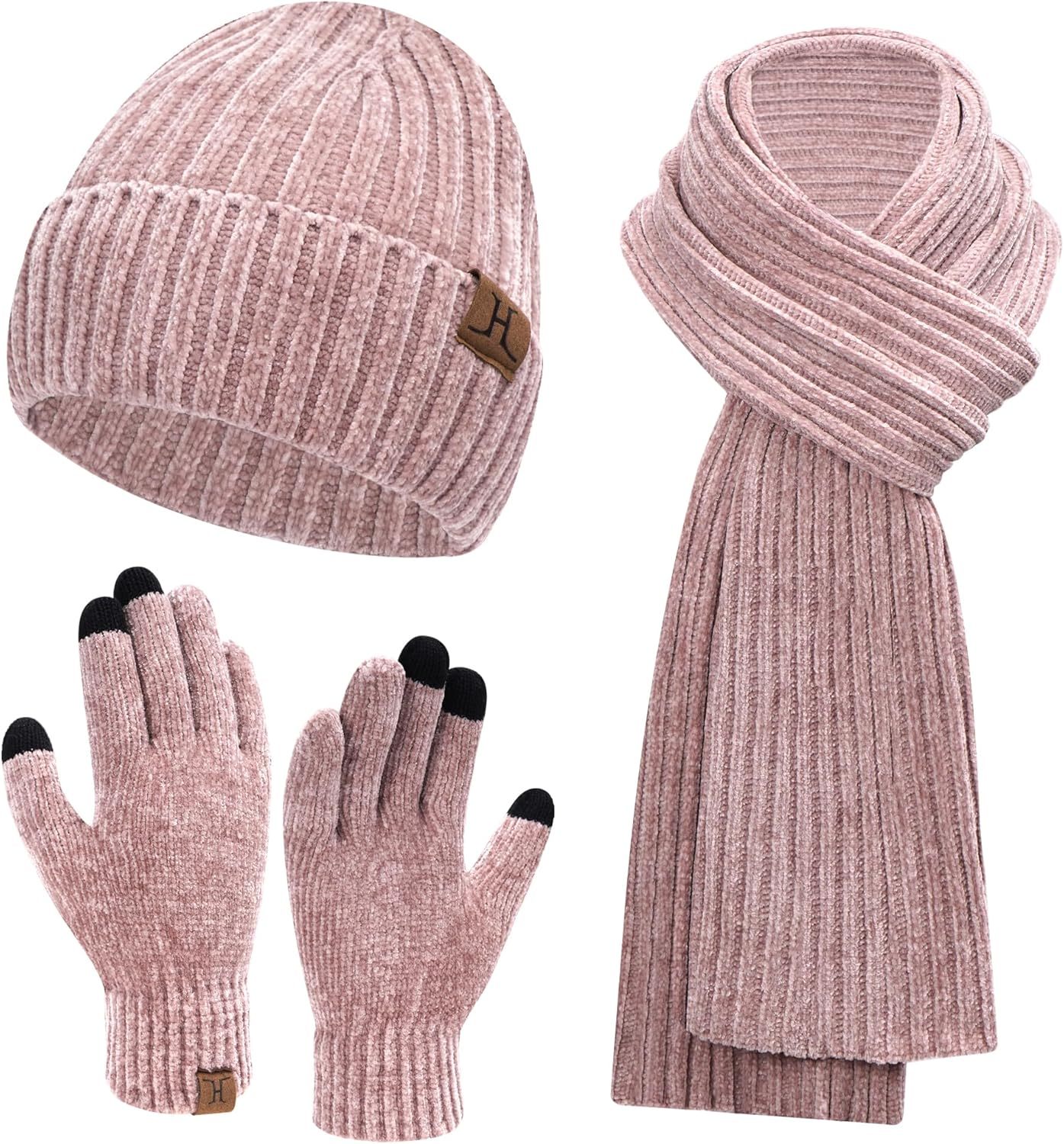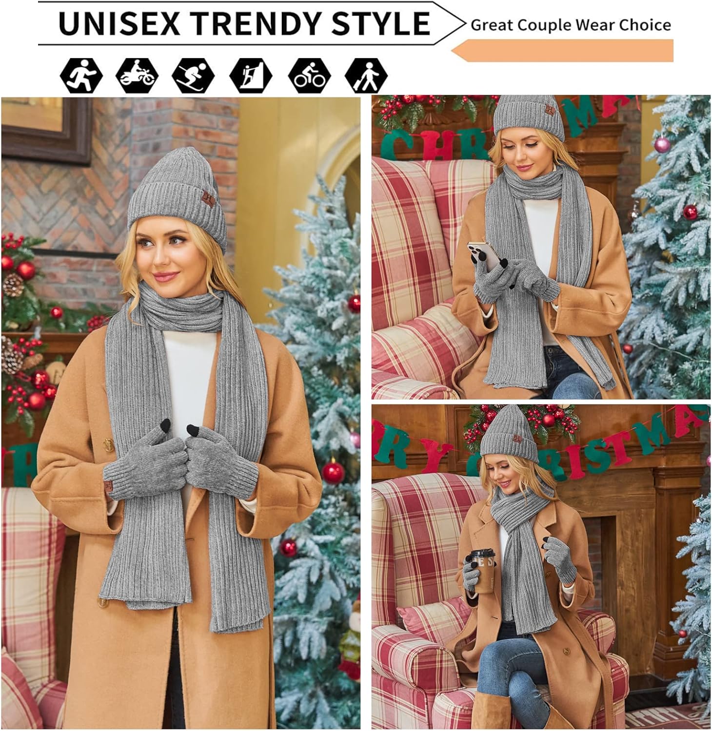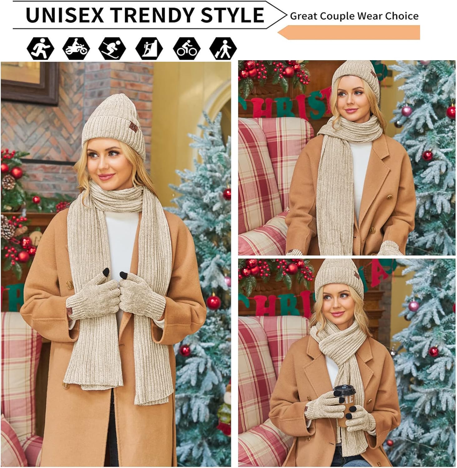 Womens Winter Knit Warm Hat Beanie Long Scarf Touch Screen Gloves Set Skull Caps Neck Scarves for Women