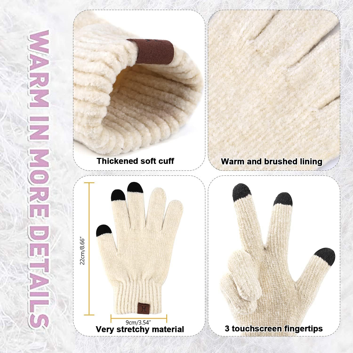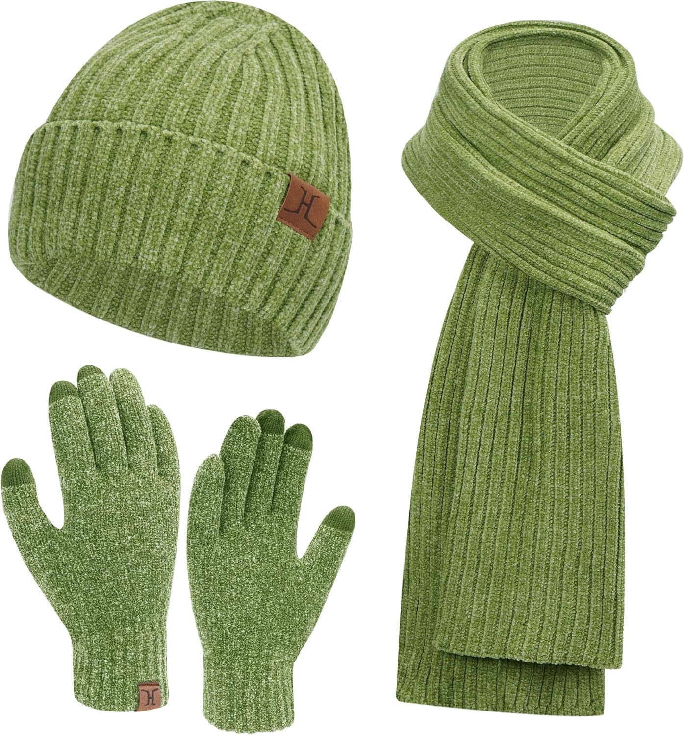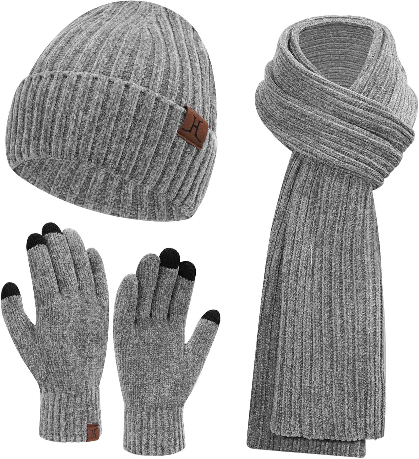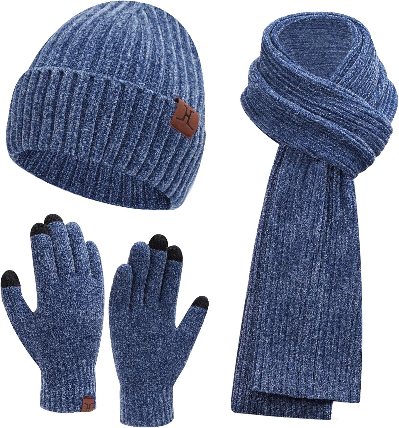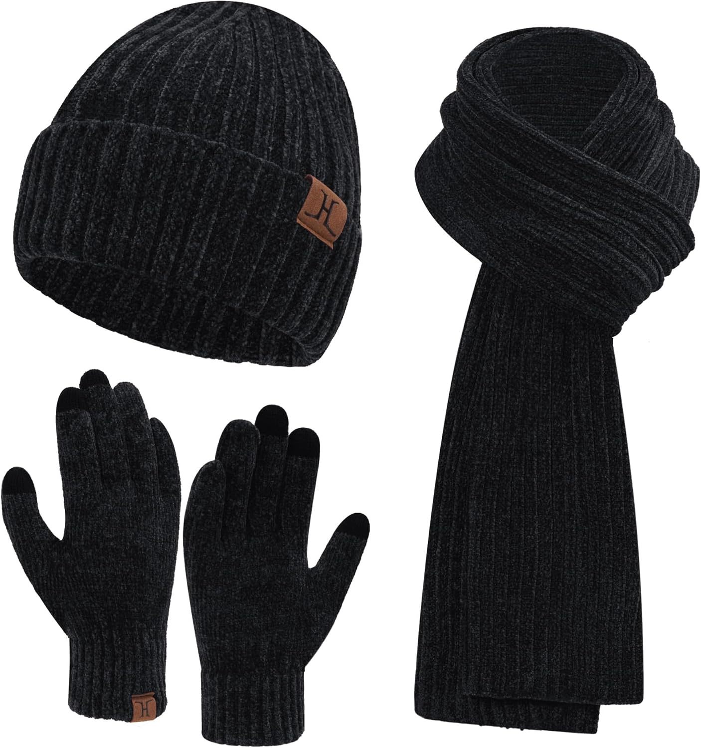 Womens Winter Knit Warm Hat Beanie Long Scarf Touch Screen Gloves Set Skull Caps Neck Scarves for Women